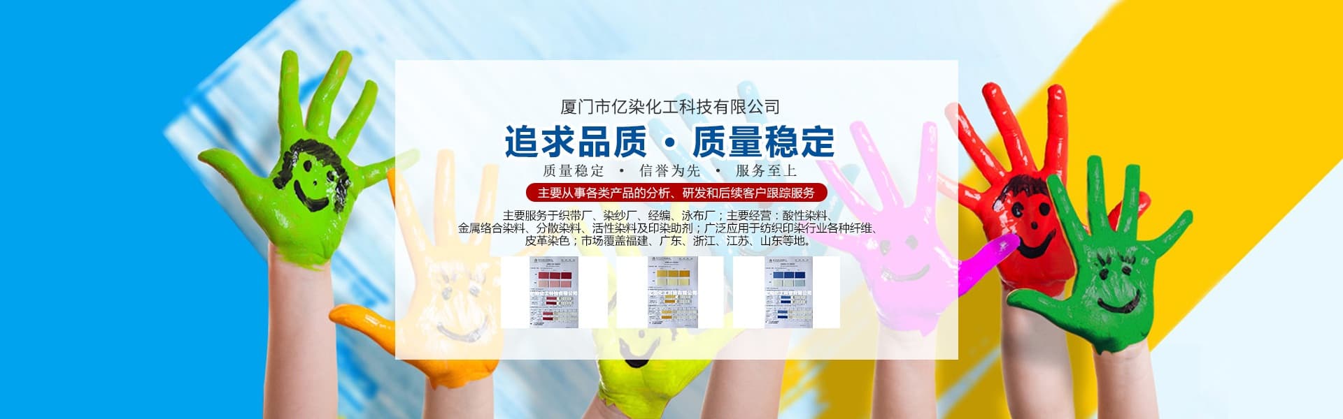 廈門市億染化工科技有限公司是一家集研發(fā)、生產(chǎn)、銷售一體的綜合型企業(yè)。公司主要經(jīng)營:酸性染料、金屬絡(luò)合染料、高牢度分散染料及印染助劑。公司信守“以誠信贏合作、以質(zhì)量贏市場(chǎng)、以創(chuàng)新贏發(fā)展、以服務(wù)贏生存”的企業(yè)精神服務(wù)于廣大客戶,多年以來建立了良好的市場(chǎng)口碑,市場(chǎng)遍布福建、廣東、浙江、江蘇、山東及東南亞國家,與多家知名企業(yè)建立了長期合作伙伴關(guān)系!